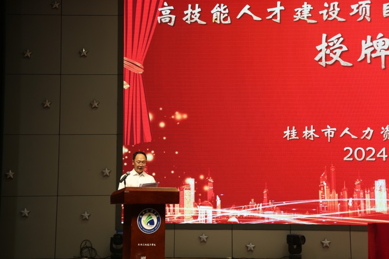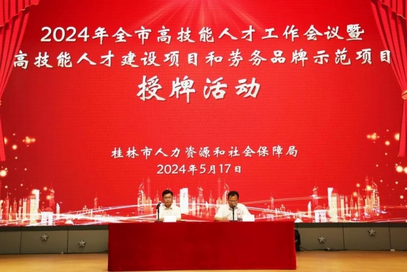 5月17日下午,2024年全市高技能人才工作会议暨高技能人才建设项目和劳务品牌示范项目授牌活动在我院大礼堂隆重举行。市人力资源社会保障局党组书记、局长,市委组织部副部长(兼)唐德华,市人社局分管局领导,驻桂林技工院校校长、业务分管校长,各县(市、区)人社局分管副局长,市人社局有关科室和部门负责同志,近年市级高技能人才建设项目、劳务品牌示范项目获得单位有关负责同志及项目获得个人,我院师生代表参加活动?;嵋橛墒腥肆ψ试春蜕缁岜U暇指本殖づ费艨鞒?。