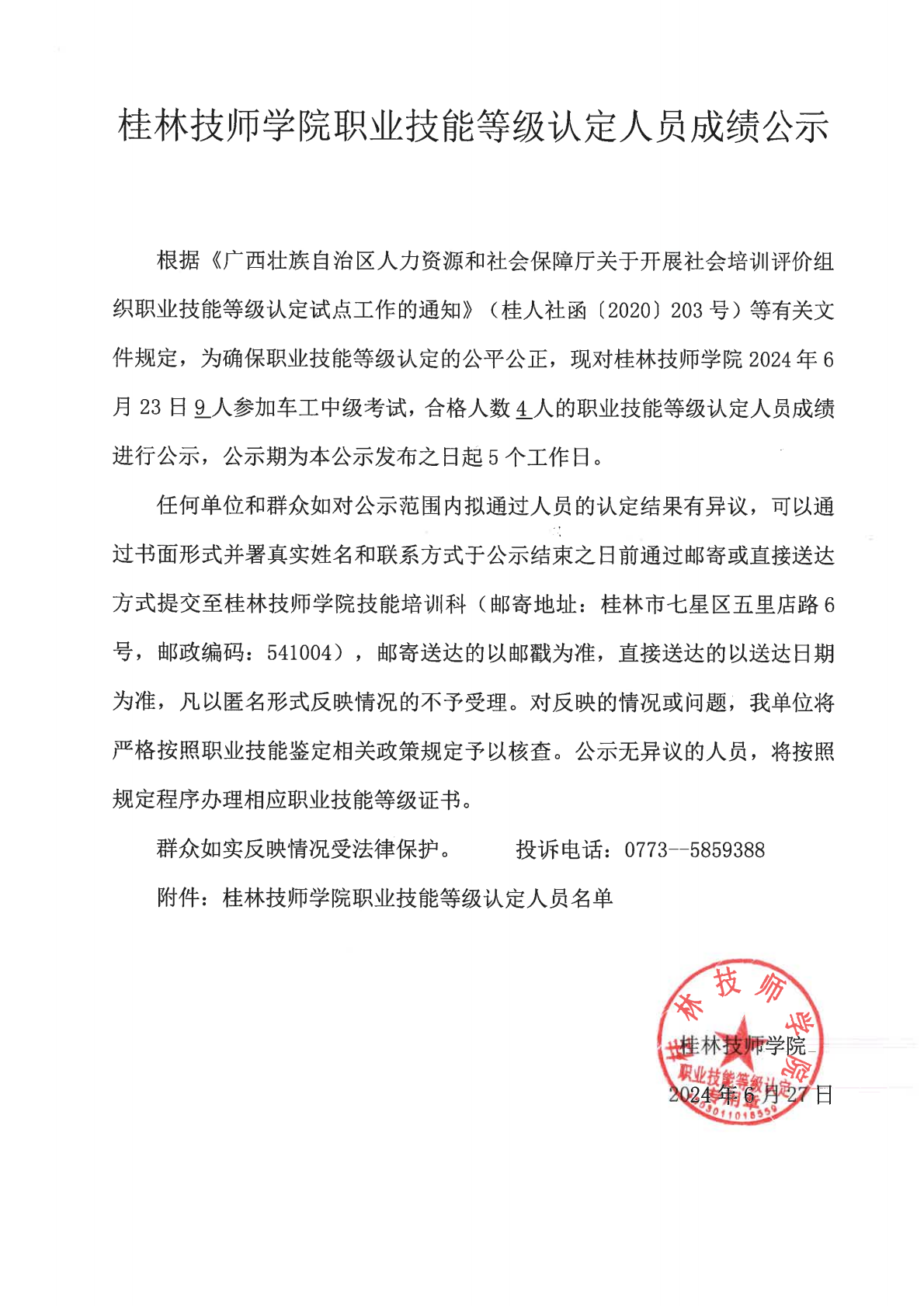 桂林技师学院职业技能等级认定240604Y0000450315010006批次成绩公示