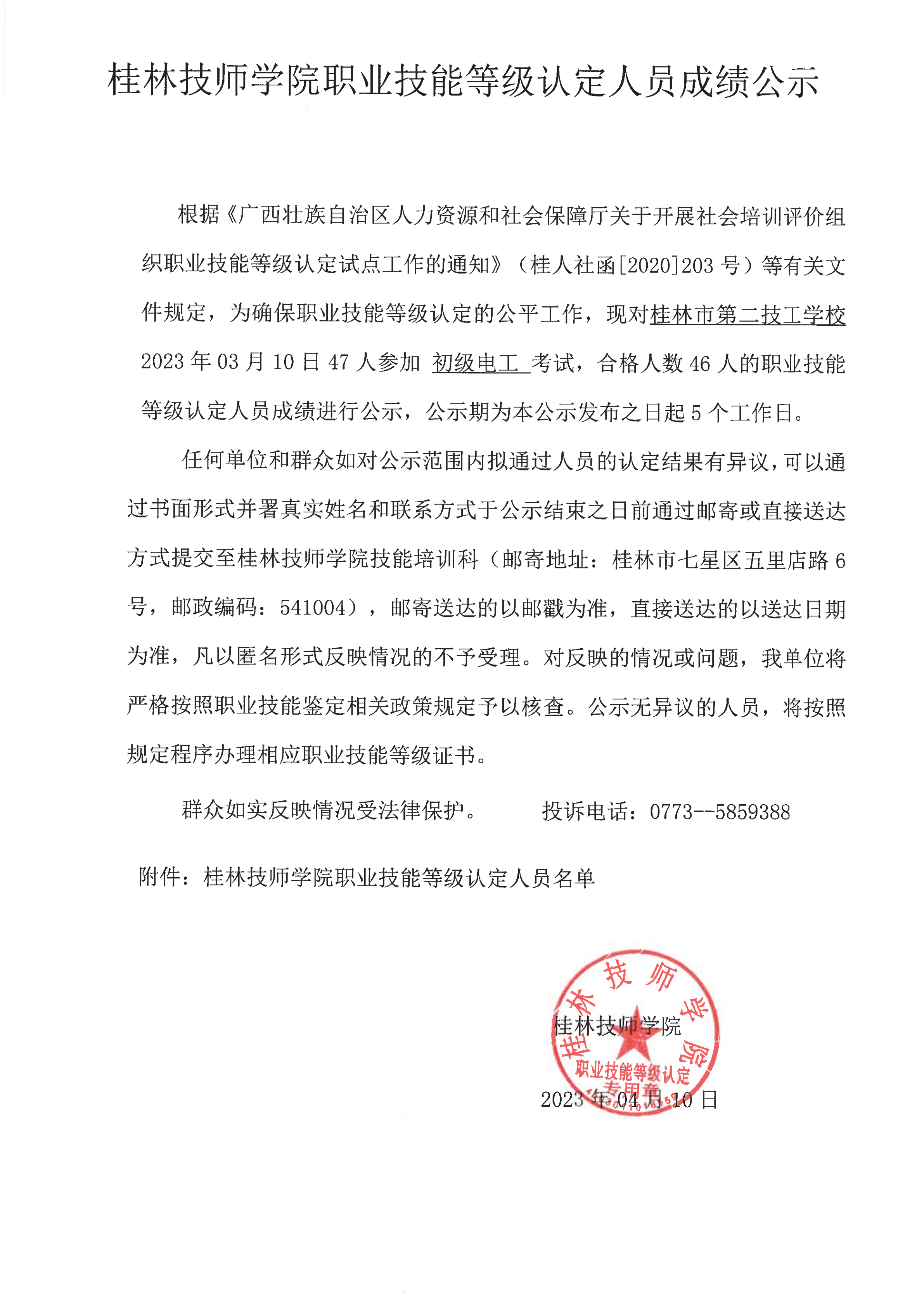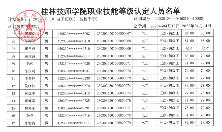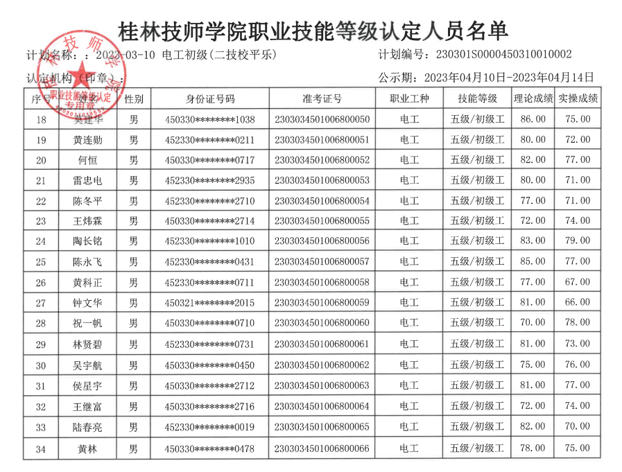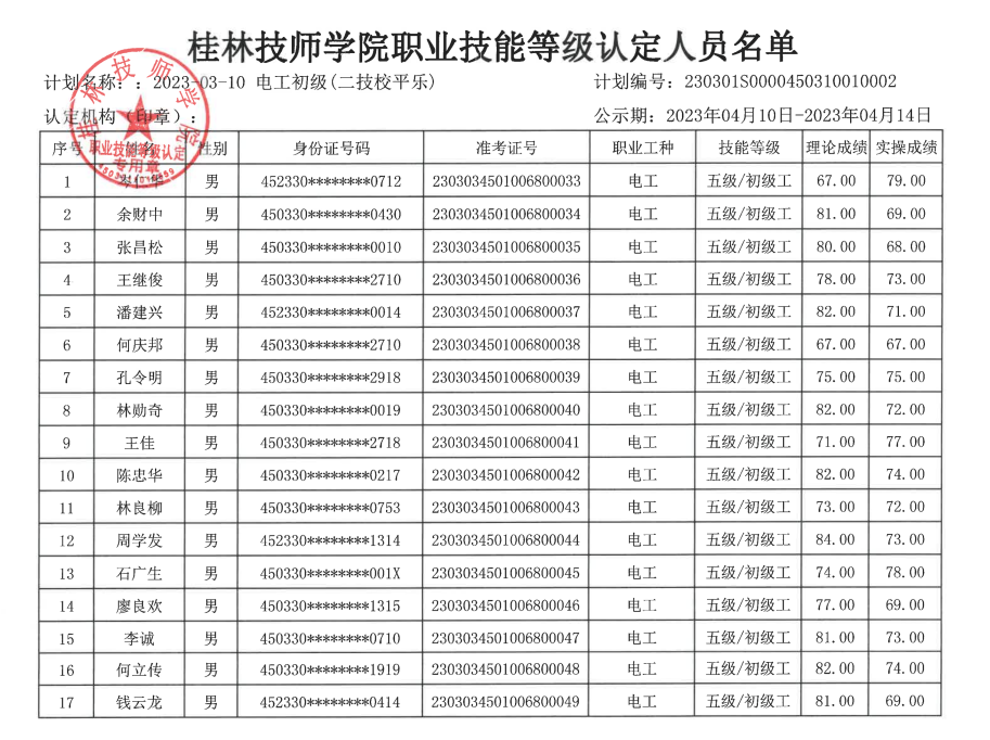 桂林技师学院职业技能等级认定230306S0000450310010004批次成绩公示