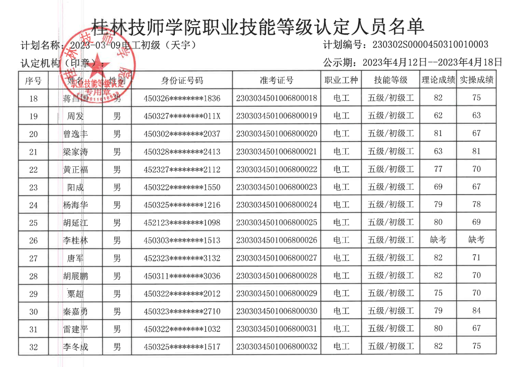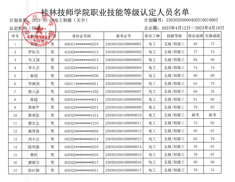 桂林技师学院职业技能等级认定230302S0000450310010003批次成绩公示