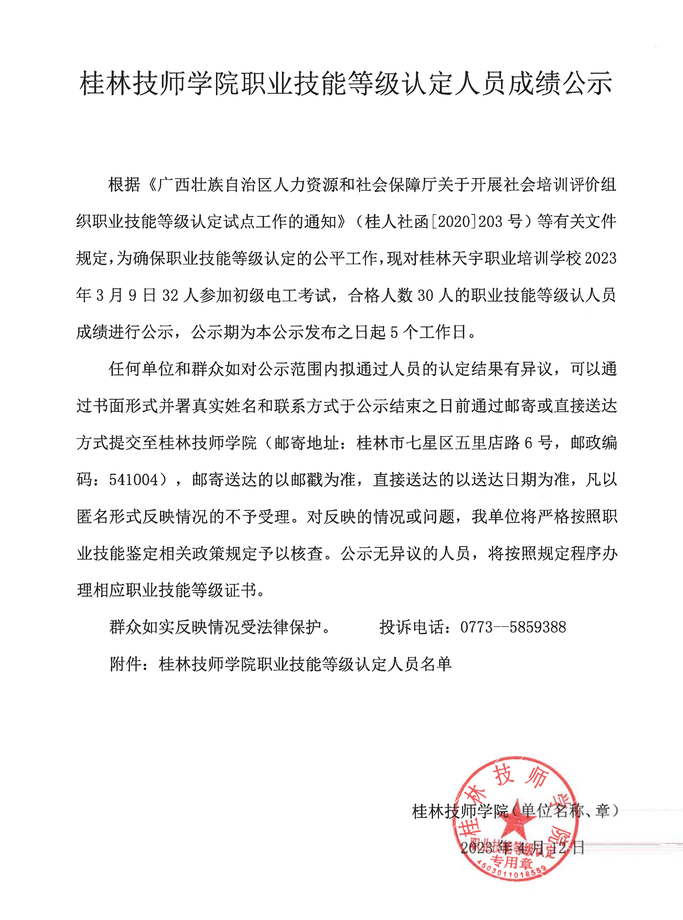 桂林技师学院职业技能等级认定230306S0000450310010005批次成绩公示