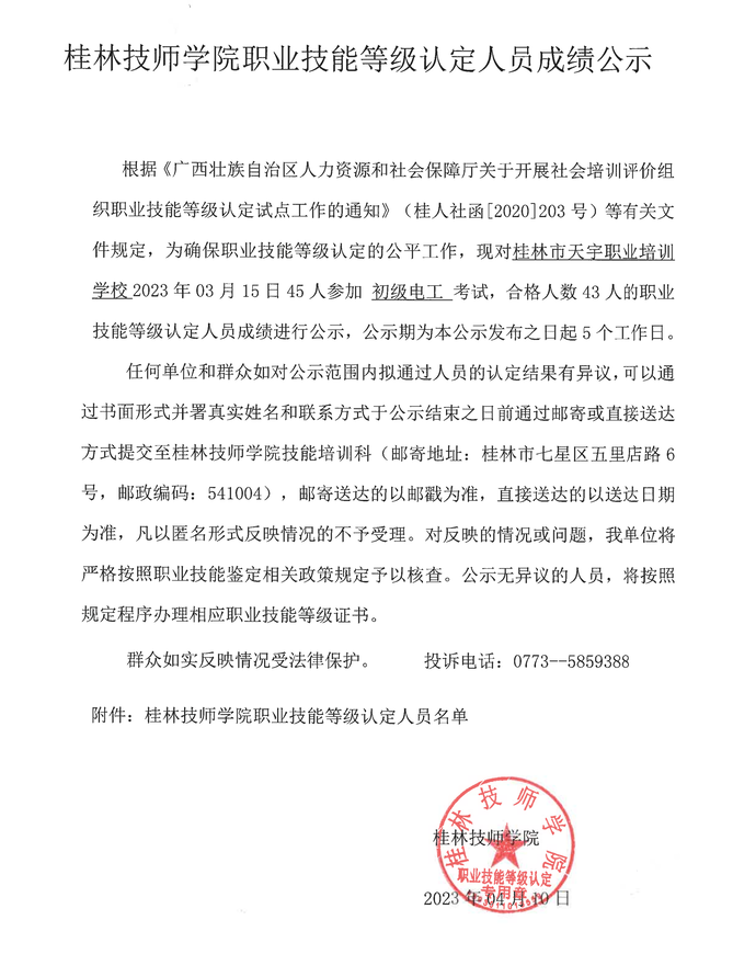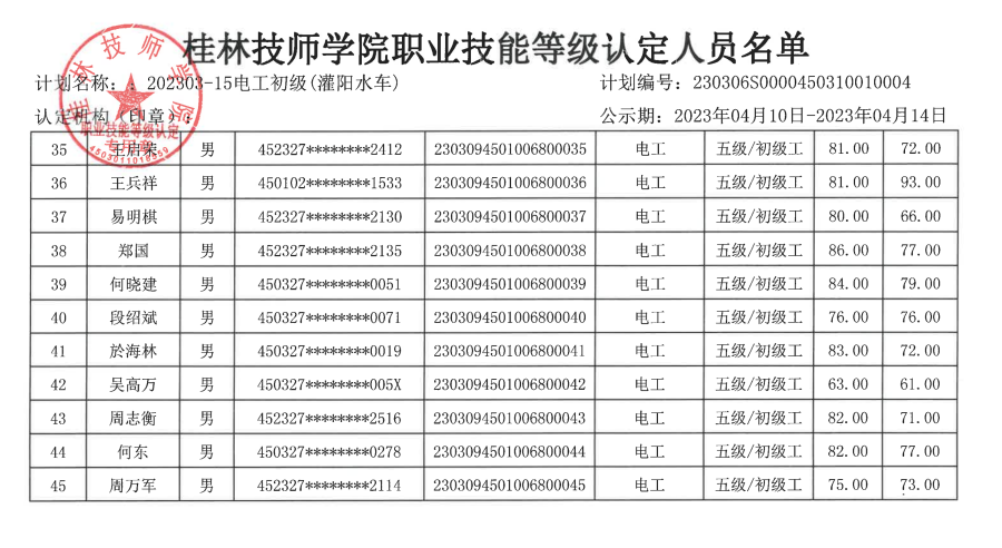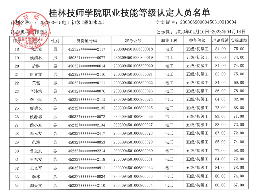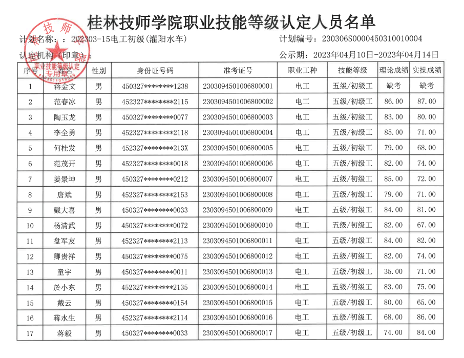 桂林技师学院职业技能等级认定230306S0000450310010004批次成绩公示