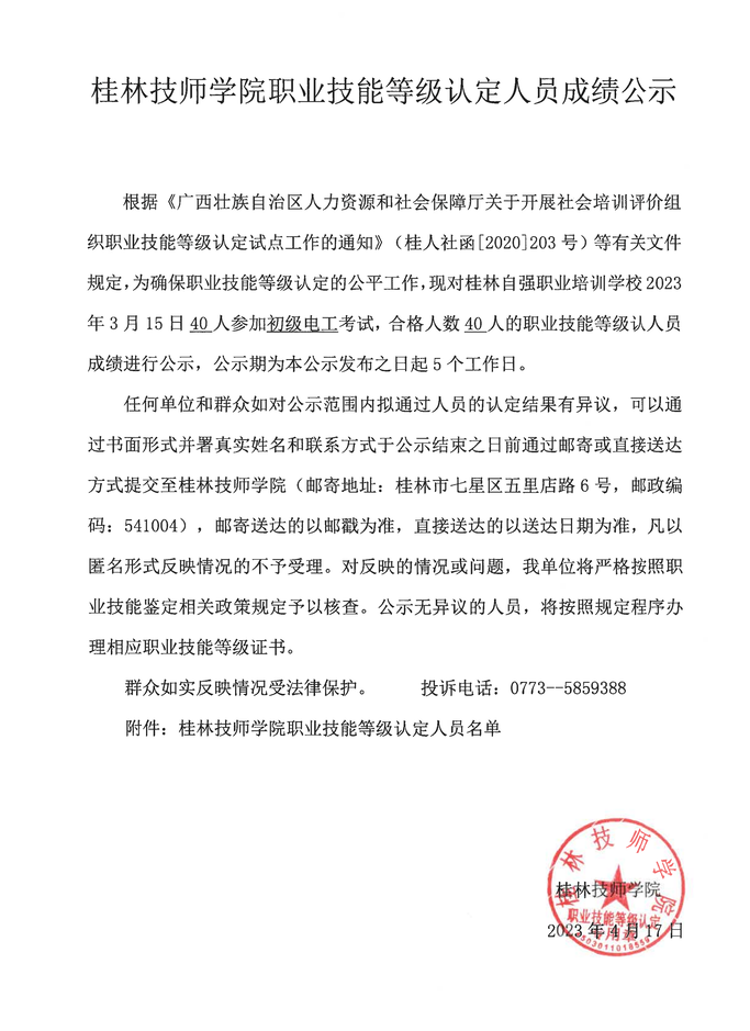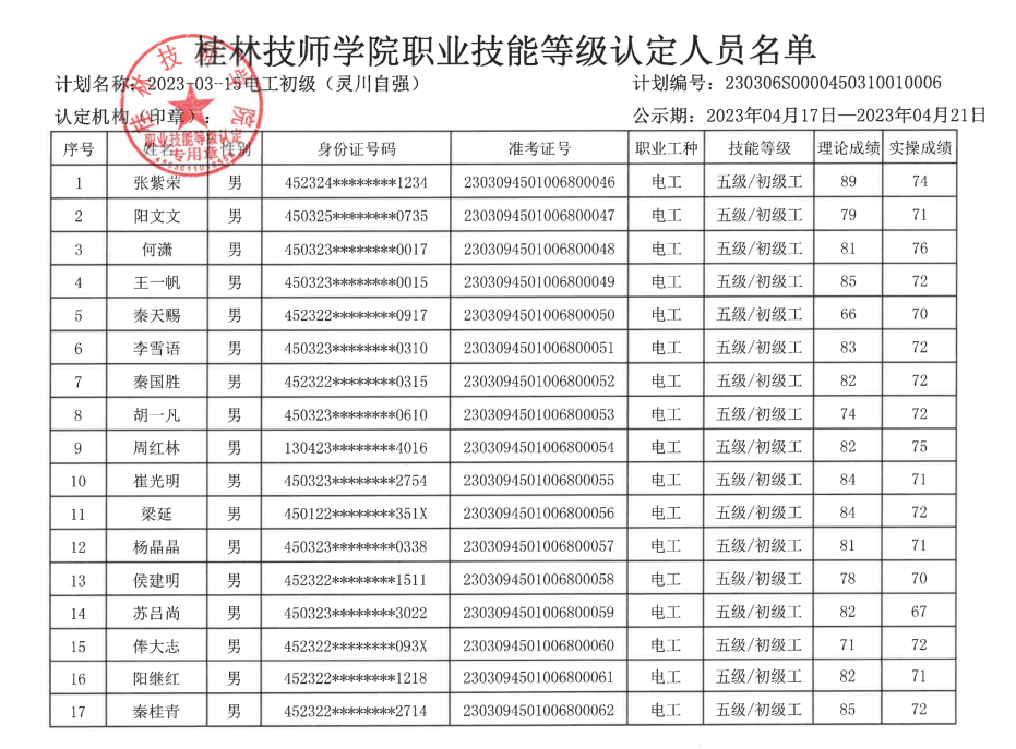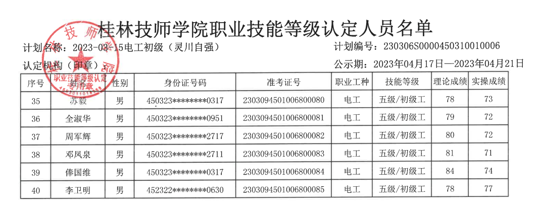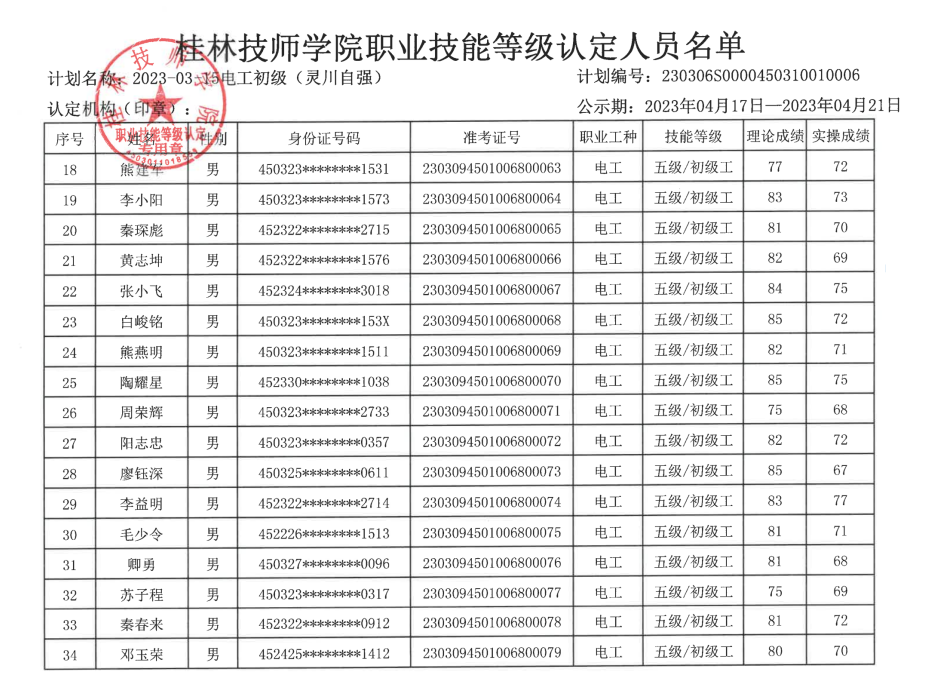 桂林技师学院职业技能等级认定230306S0000450310010005批次成绩公示