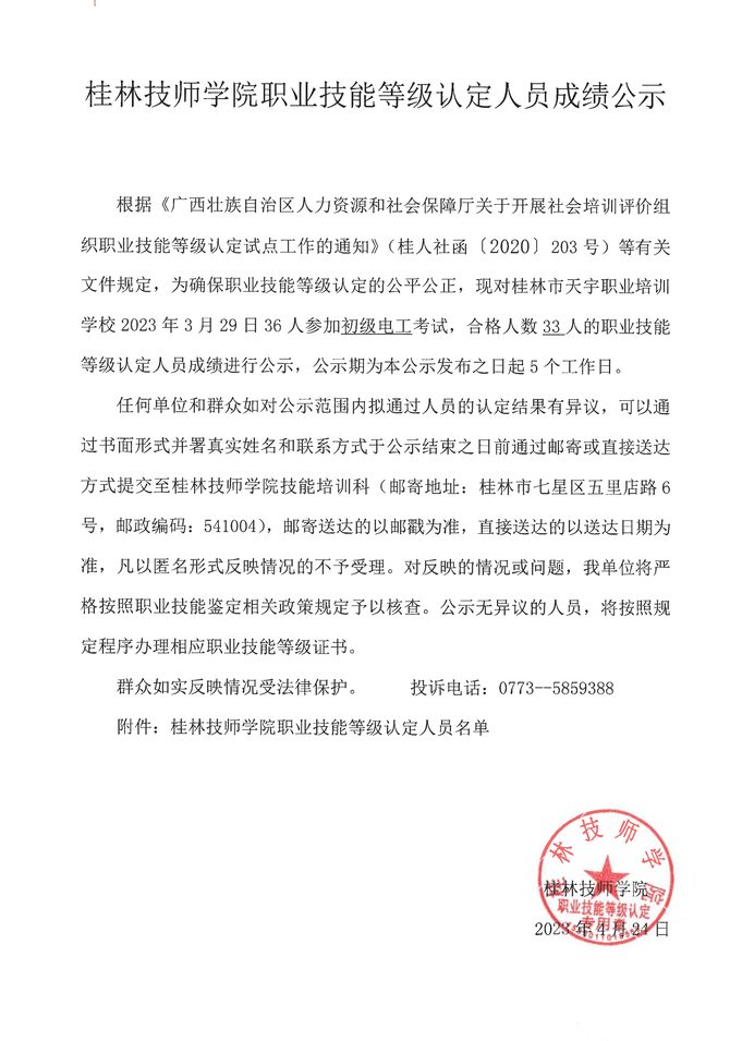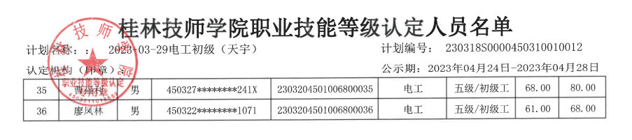 桂林技师学院职业技能等级认定230314S0000450310010009批次成绩公示