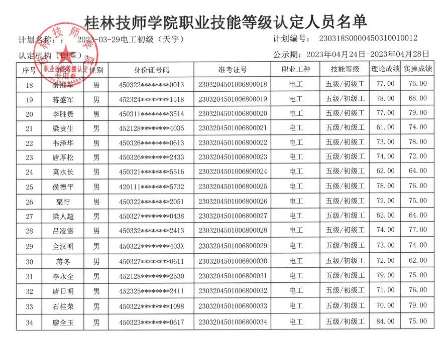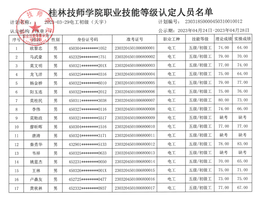 桂林技师学院职业技能等级认定230318S0000450310010012批次成绩公示