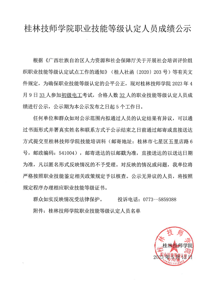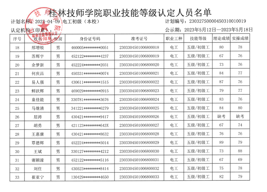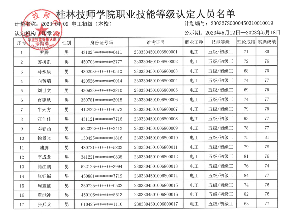 桂林技师学院职业技能等级认定230327S0000450310010019批次成绩公示
