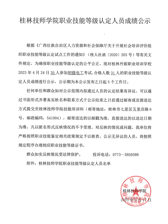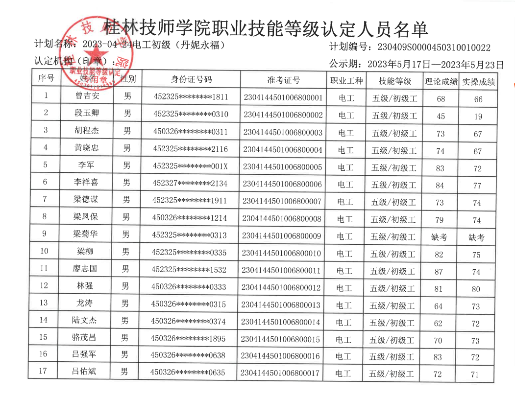 桂林技师学院职业技能等级认定230412S0000450310010024批次成绩公示