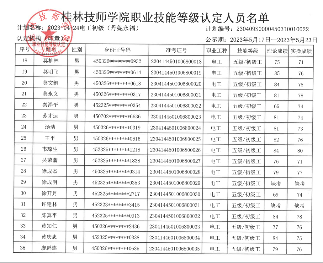 桂林技师学院职业技能等级认定230404S0000450310010021批次成绩公示