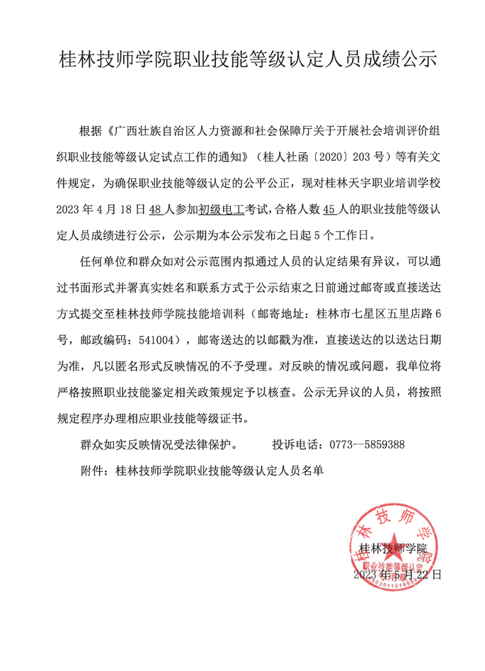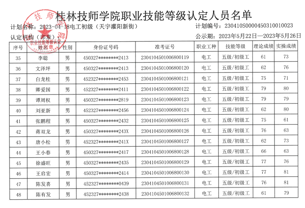 桂林技师学院职业技能等级认定230410S0000450310010023批次成绩公示