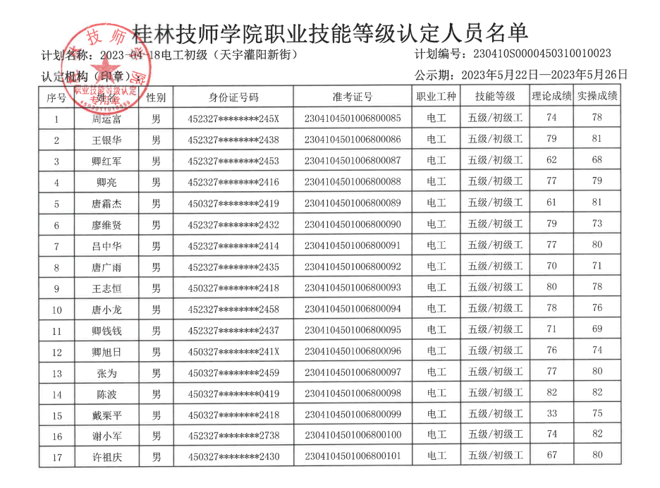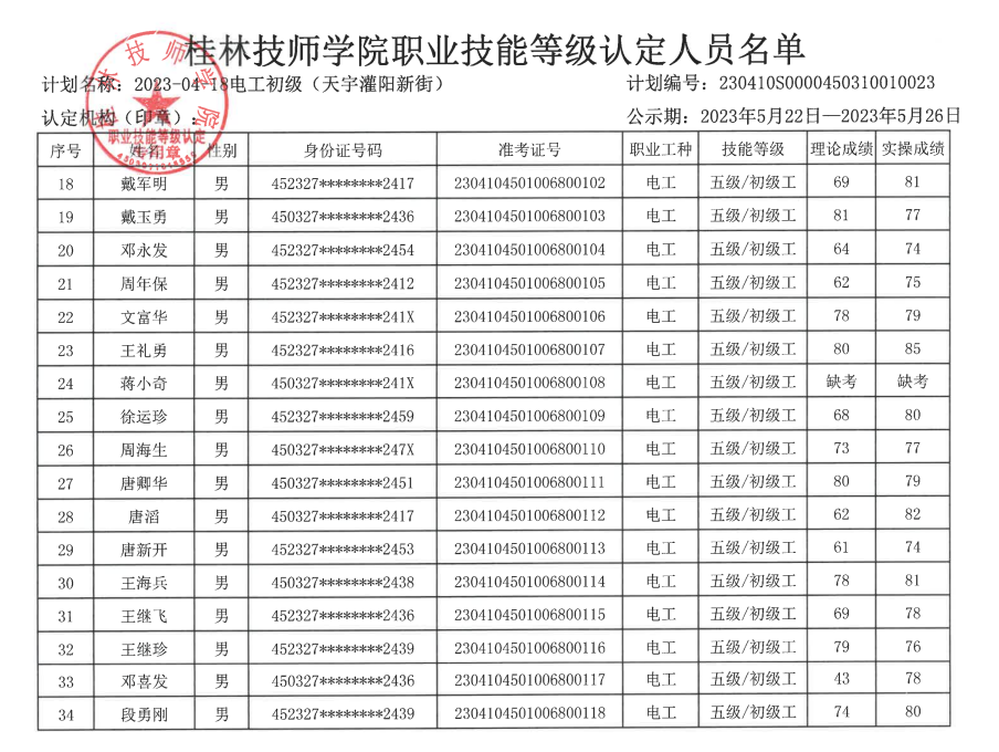 桂林技师学院职业技能等级认定230420S0000450310010028批次成绩公示