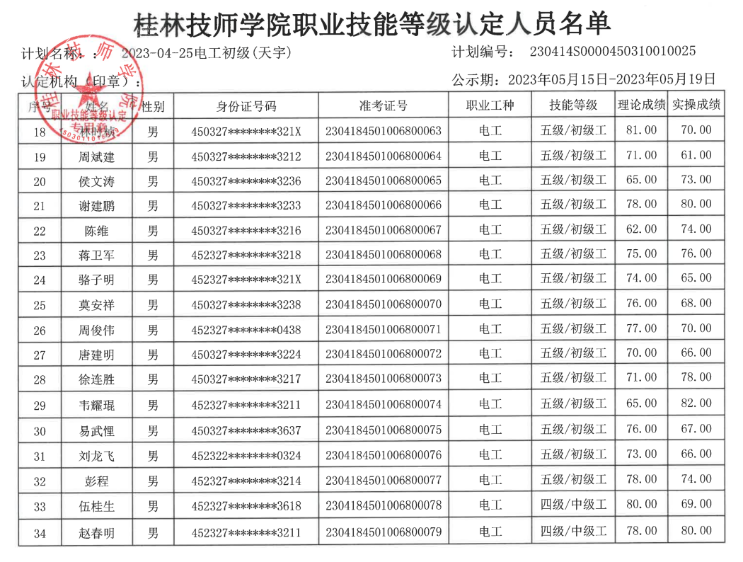 桂林技师学院职业技能等级认定230404S0000450310010021批次成绩公示