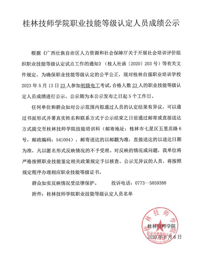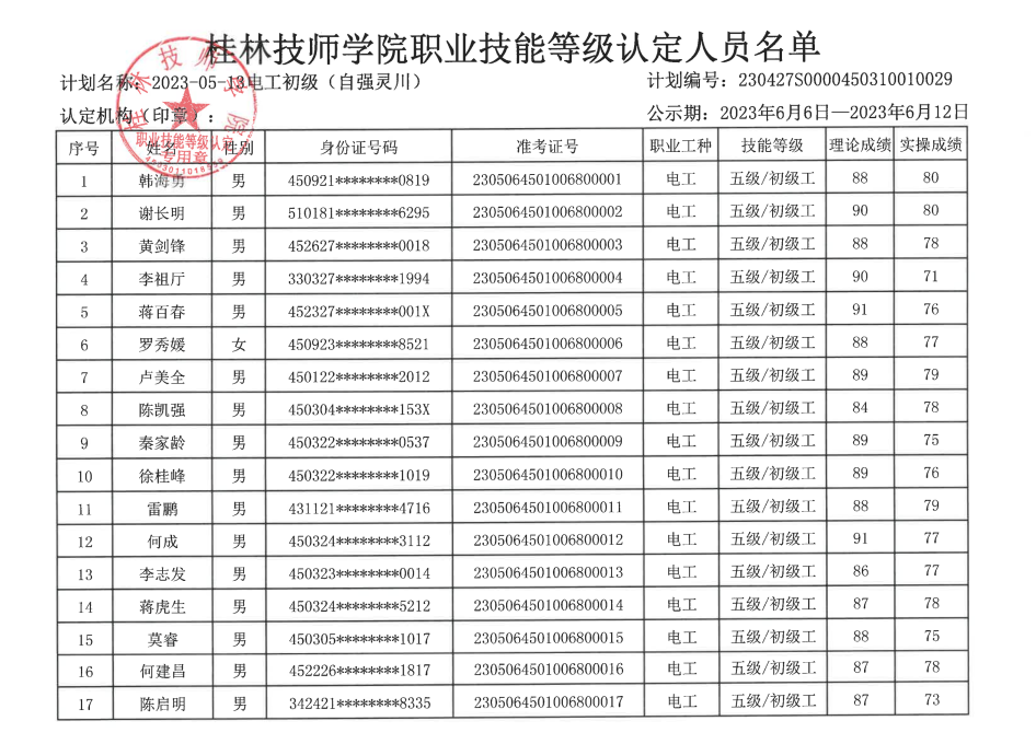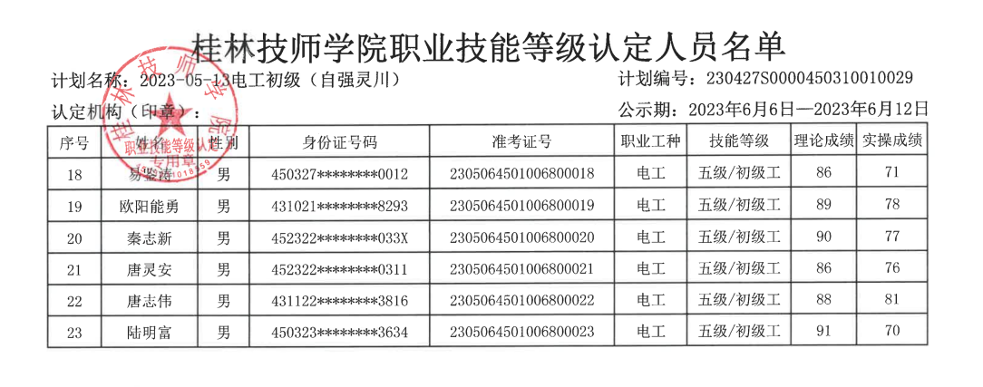 桂林技师学院职业技能等级认定230506S0000450310010030批次成绩公示