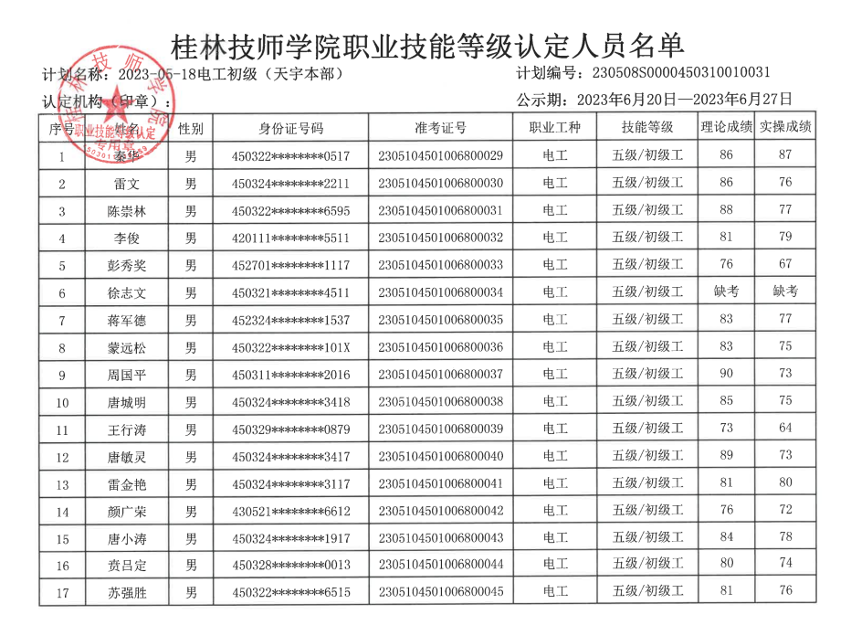 桂林技师学院职业技能等级认定230506S0000450310010030批次成绩公示