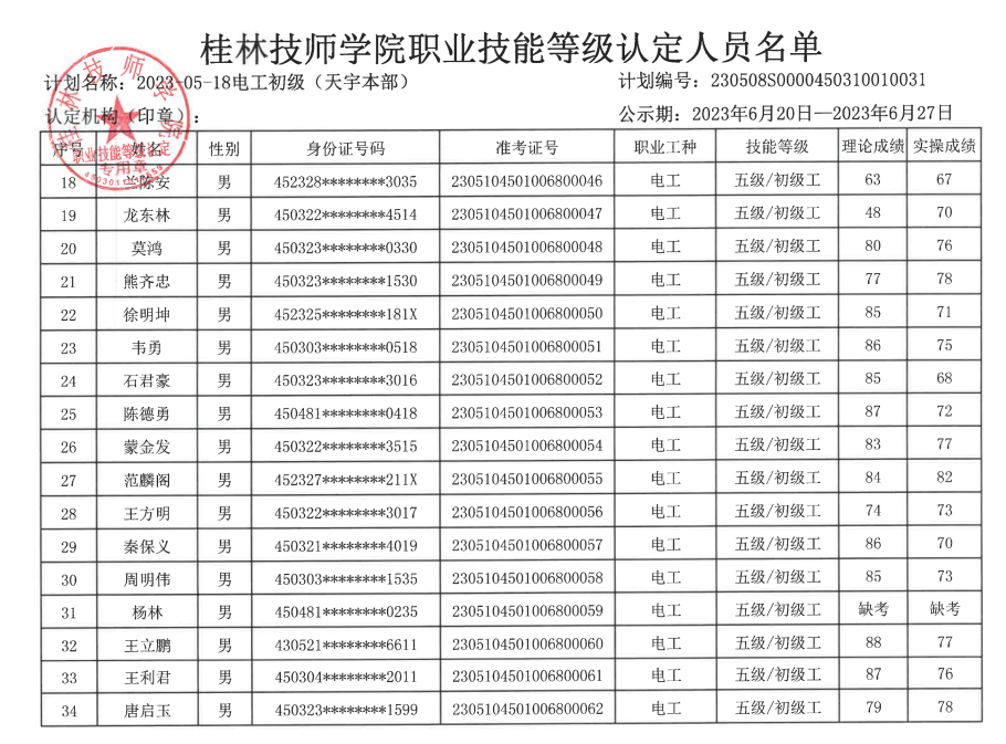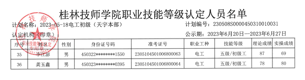 桂林技师学院职业技能等级认定230508S0000450310010031批次成绩公示
