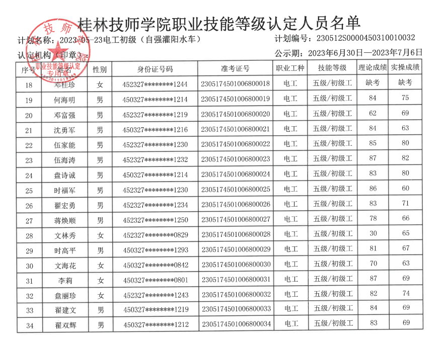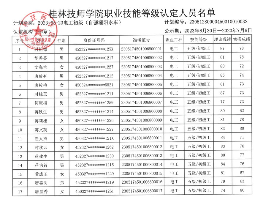桂林技师学院职业技能等级认定230508S0000450310010031批次成绩公示