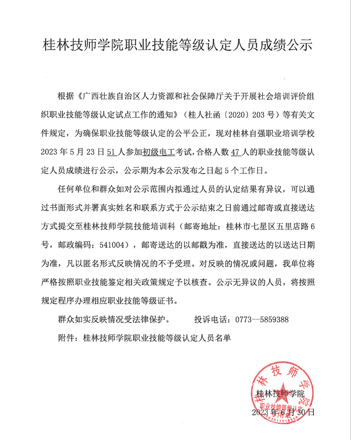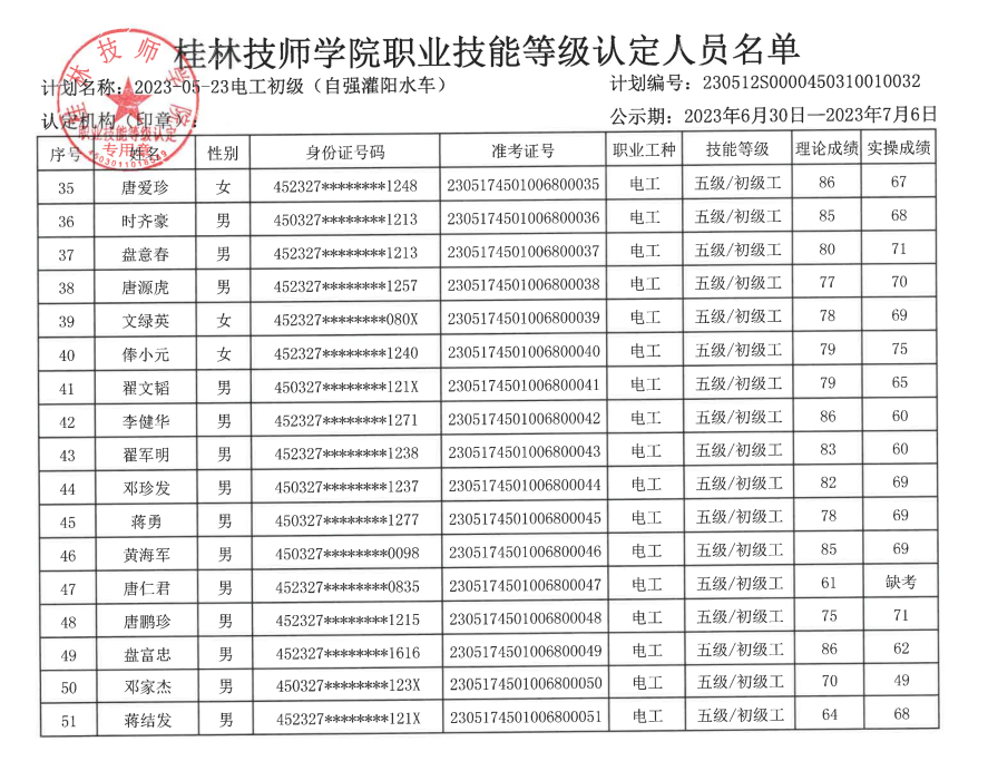 桂林技师学院职业技能等级认定230513S0000450310010033批次成绩公示