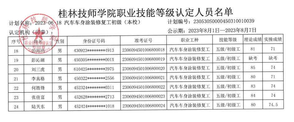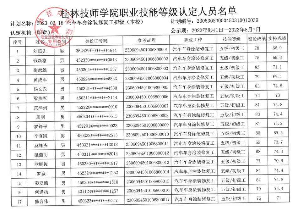 桂林技师学院职业技能等级认定230518S0000450310010035批次成绩公示