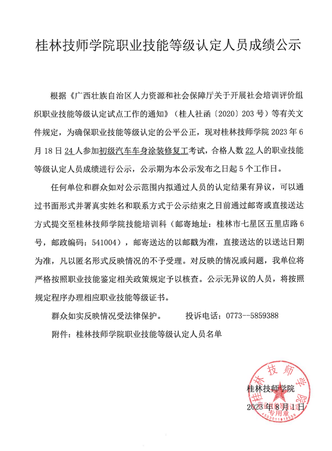 桂林技师学院职业技能等级认定230530S0000450310010039批次成绩公示