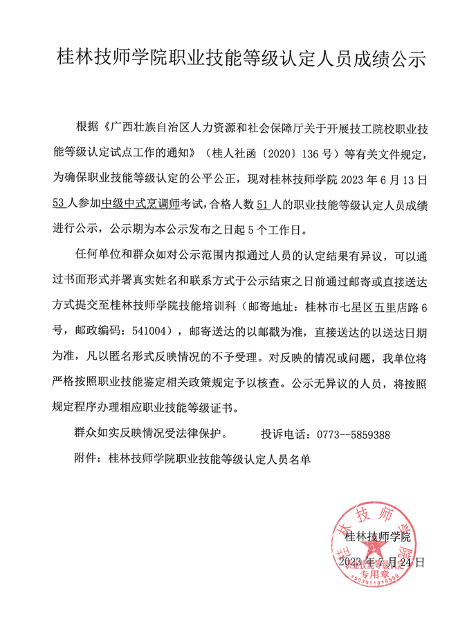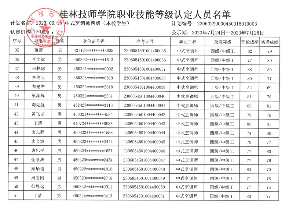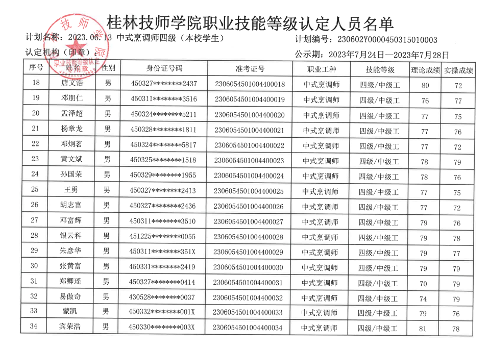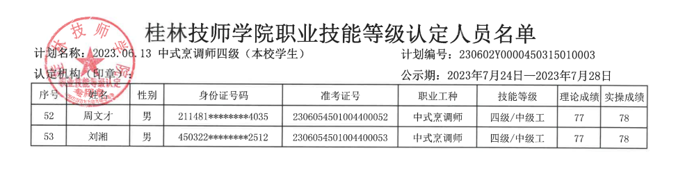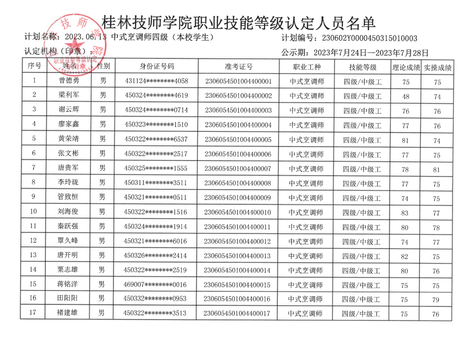 桂林技师学院职业技能等级认定230602Y0000450315010003批次成绩公示