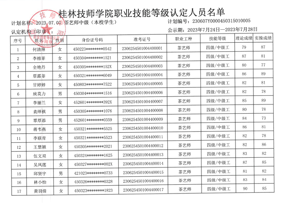 桂林技师学院职业技能等级认定230506Y0000450315010001批次成绩公示