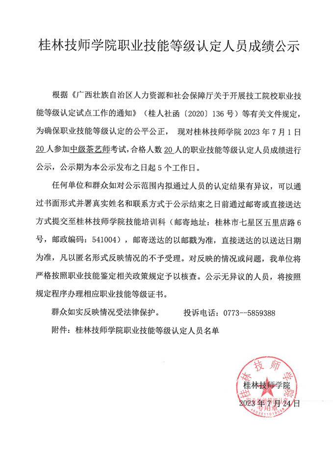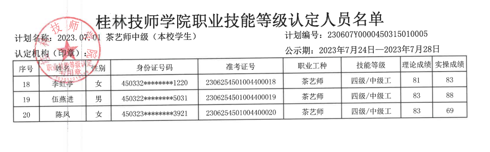 桂林技师学院职业技能等级认定230607Y0000450315010005批次成绩公示