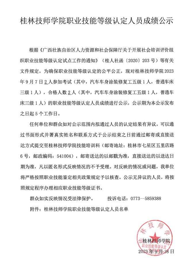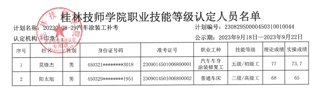 桂林技师学院职业技能等级认定230829S0000450310010044批次成绩公示
