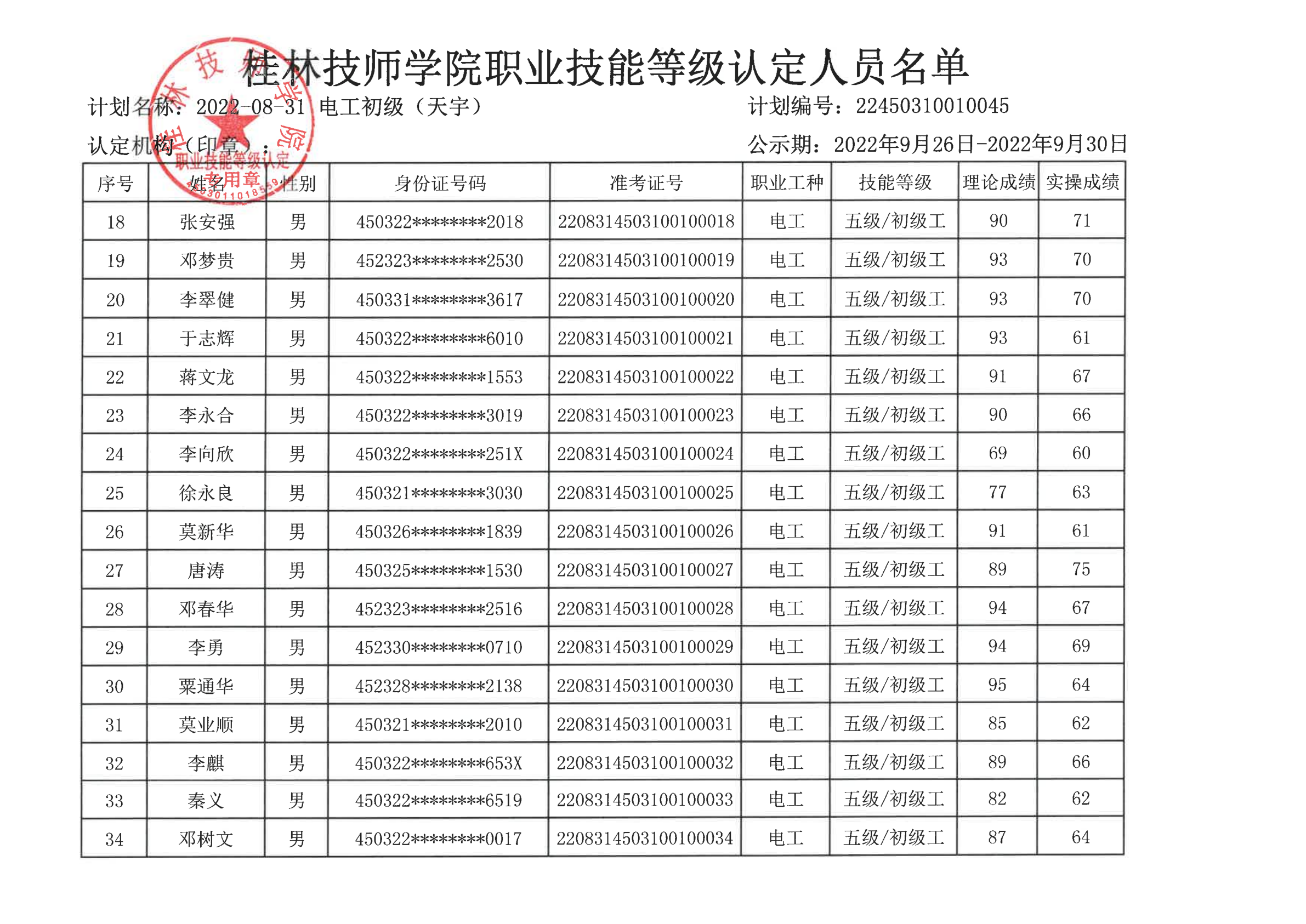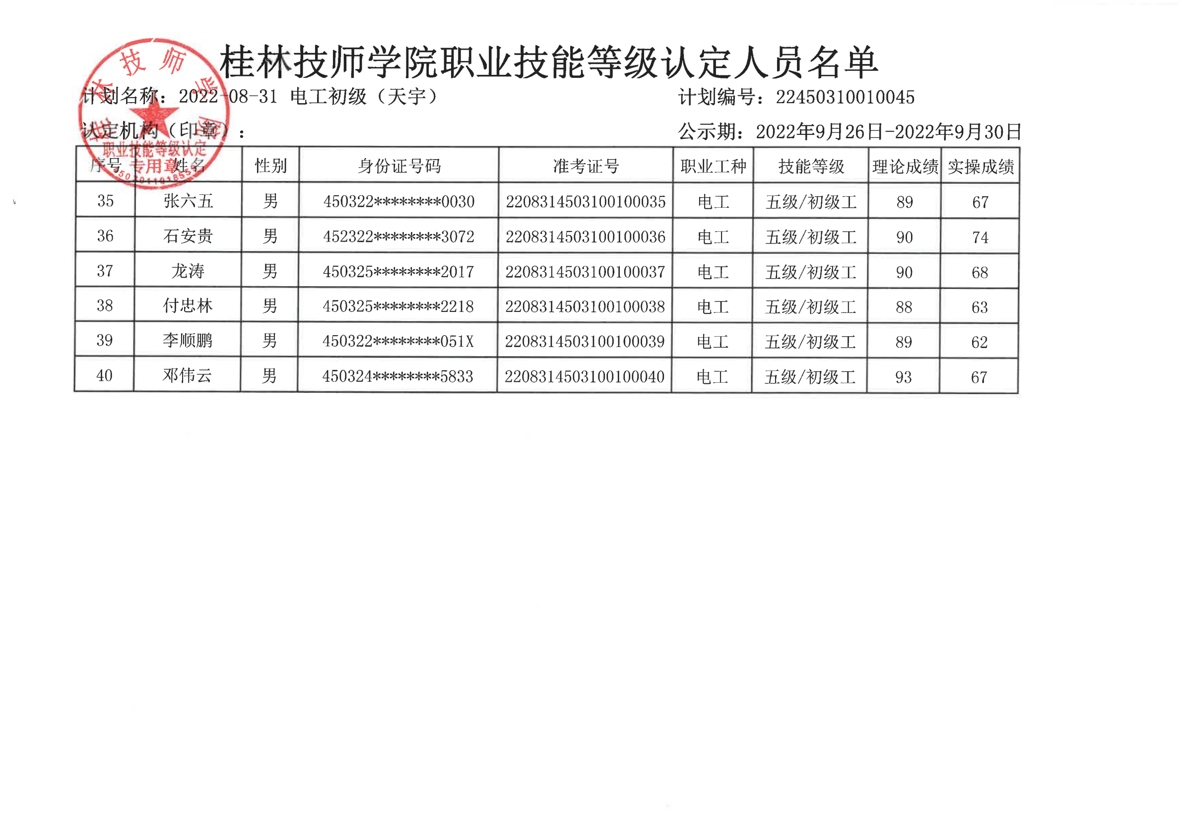 桂林技师学院职业技能等级认定22450310010045批次成绩公示