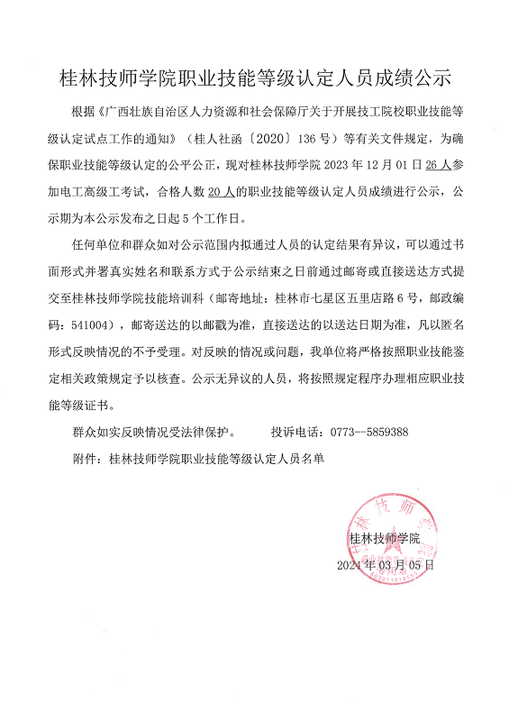 桂林技师学院2023-2024学年第二学期应届毕业生职业技能等级认定公告