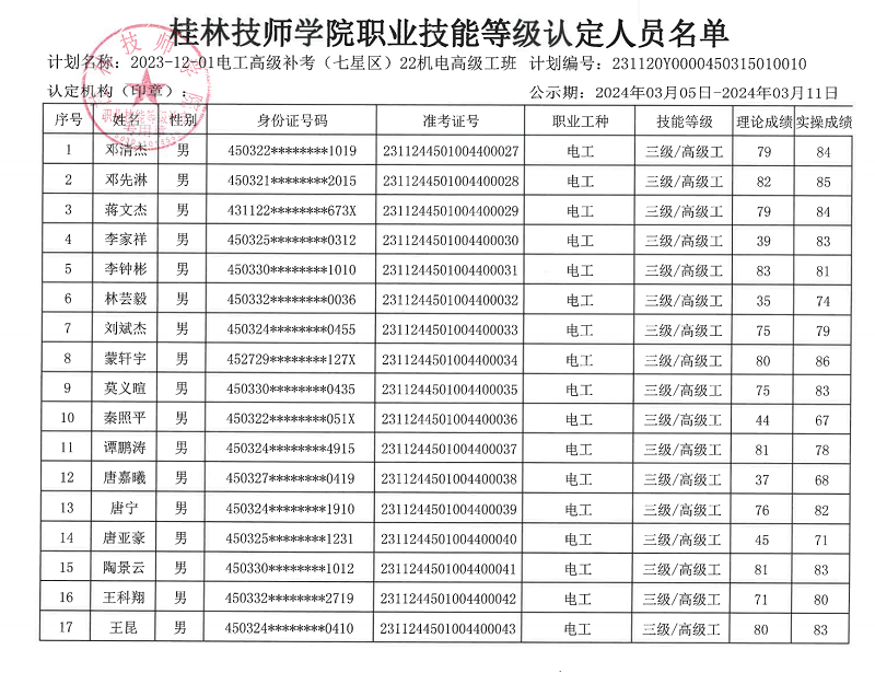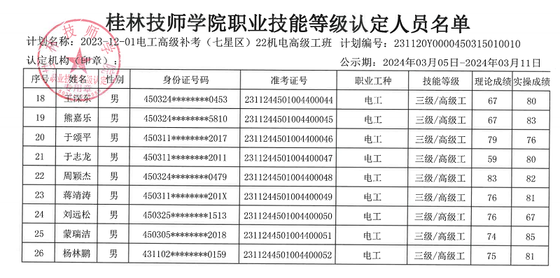 桂林技师学院职业技能等级认定231227Y0000450315010018批次成绩公示