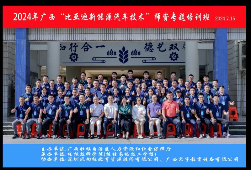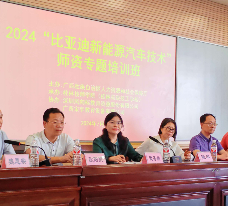 2024年7月15日上午,由广西壮族自治区人力资源和社会保障厅主办,桂林技师学院承办,深圳风向标教育资源股份有限公司、广西宋宇教育设备有限公司协办的2024年广西“比亚迪新能源汽车技术”师资专题培训在桂林技师学院顺利开班。此次专题培训,旨在贯彻落实《关于进一步加强新时代高技能人才队伍建设的若干措施》,推动技能强企,强化新能源、制造业企业技术技能人才供给,提升我区教师新能源汽车技术的教学能力。