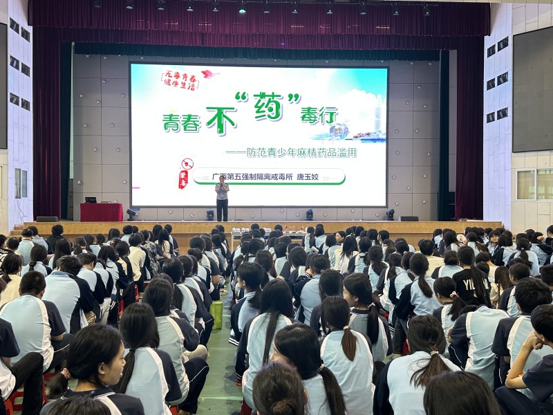 活动现场,广西第五强制隔离戒毒所教育科二级警长唐玉娇以“青春不‘药’毒行”为题,从同学们身边常见的药品入手,借助图文并茂的PPT、真实案例视频以及互动有奖问答等多种形式,深入浅出地讲解了麻精药品的相关知识。“什么是药物滥用?适量为药,过量成毒。”唐警长特别指出,安眠药、减肥药、止咳糖浆等常见的药品在适量使用时是治病救人的良药,但一旦被滥用或过量使用,便可能沦为毒品,对身体和精神造成严重损害,包括成瘾性、身体机能障碍、精神障碍等,她提醒同学们务必提高警惕,遵循医嘱合理用药,避免陷入毒品陷阱。为了加深同学们的理解,现场还设置了有奖问答环节,同学们积极参与,踊跃回答问题,在轻松愉快的氛围中进一步加深了对禁毒知识的理解。