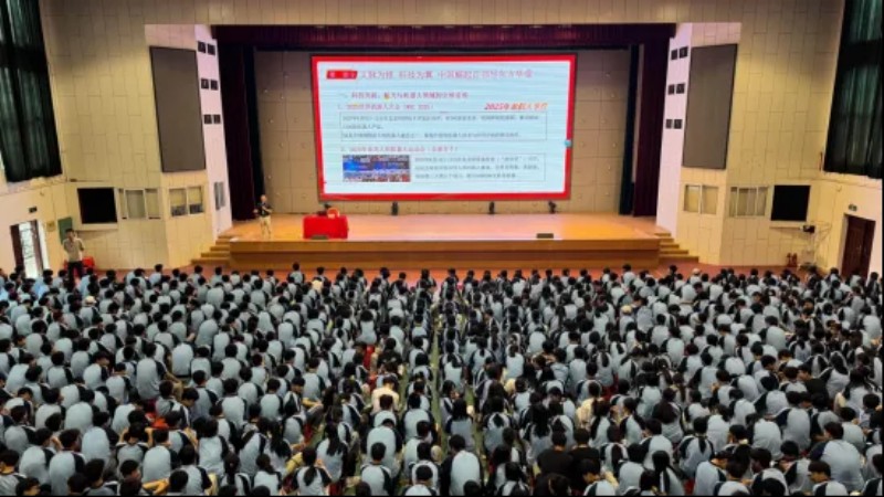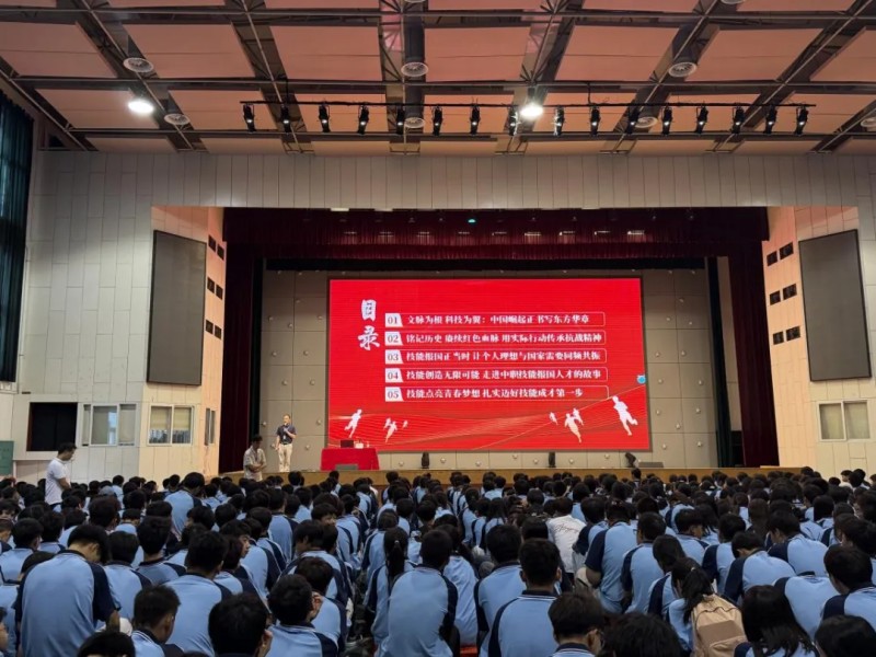 李金河特别讲述了第47届世界技能大赛化学实验室技术项目冠军鲁静怡的冠军之路,从她的刻苦训练到赛场上的精彩表现,再到为国家赢得荣誉,鲁静怡的故事深深打动了在场的每一位同学。李金河问大家:“同学们,你们有没有信心像金牌选手一样,通过努力掌握技能,实现自己的梦想?”同学们都大声回答:“有信心!”响亮的回答回荡在大礼堂,展现出同学们昂扬向上的精神风貌。